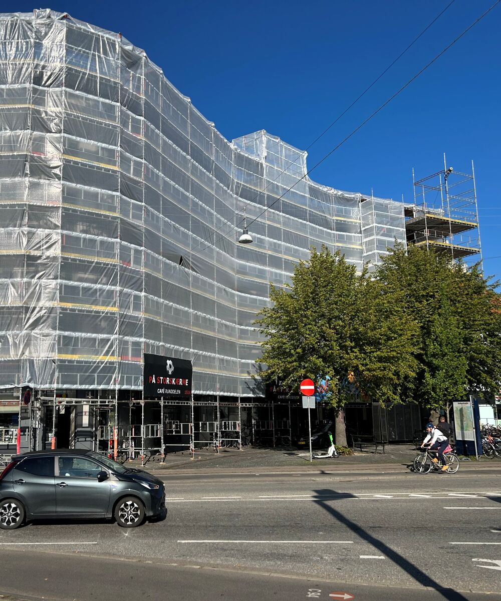 Barberens facadestilladsEn ældre ejendom på Nørrebros Runddel skulle gennem en komplet facaderenovering – fra sandblæsning til murer- og malerarbejde samt udskiftning af alle vinduer. Til opgaven leverede vi et svært stålstillads med traller fra HAKI, suppleret med plastinddækning og klimaskærm. Løsningen skabte stabile og sikre arbejdsforhold og bidrog til en effektiv byggeproces fra start til slut.